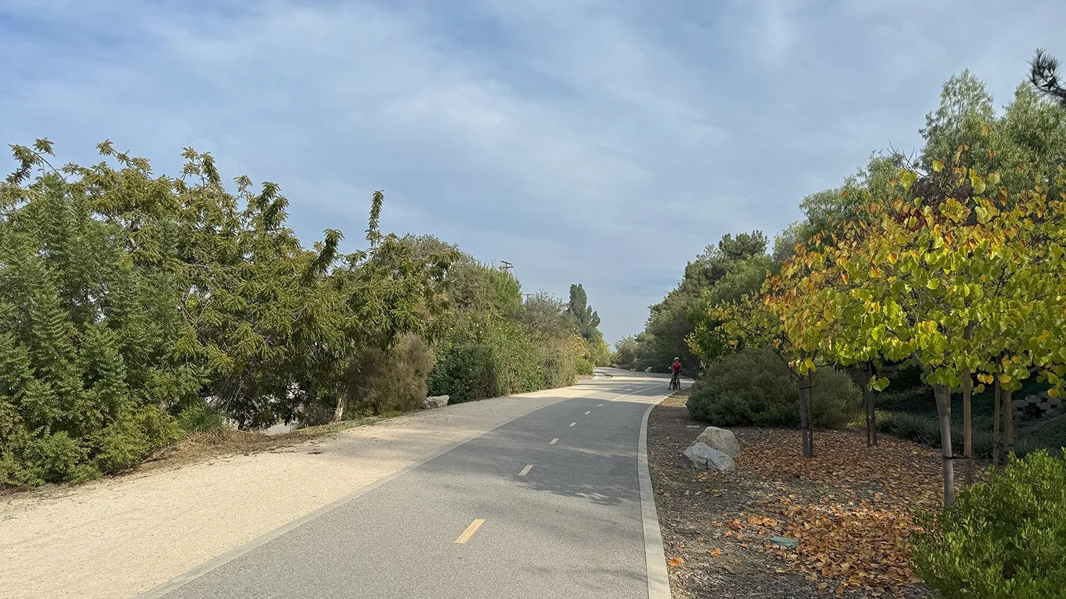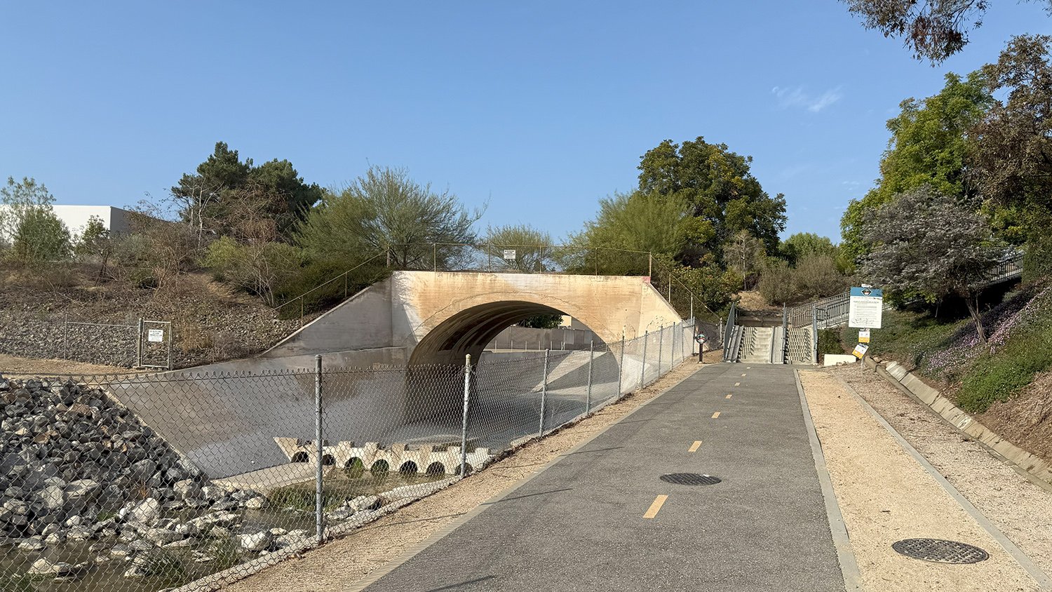 The Tracks at Brea was my first ride. It’s a great path, approximately 4-miles-long, a smoothly paved two-way lane with only a few street crossings. Perfect. Benches along the way, some nice shady areas and a public restroom right along the route. Here’s some pics: